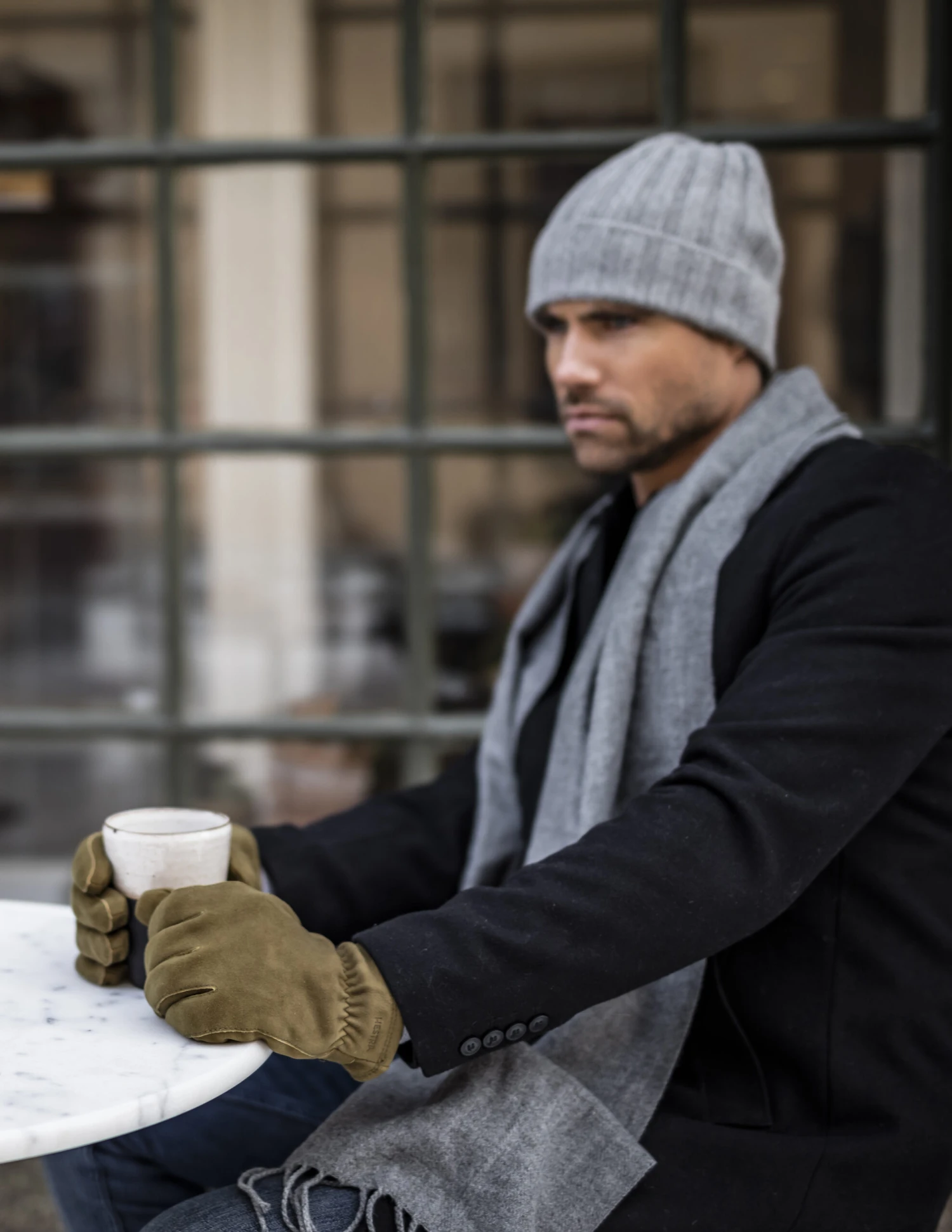 A handsewn glove made of suede and chrome-free tanned Chamois goat leather, lined with 100% wool with decorative out seams.