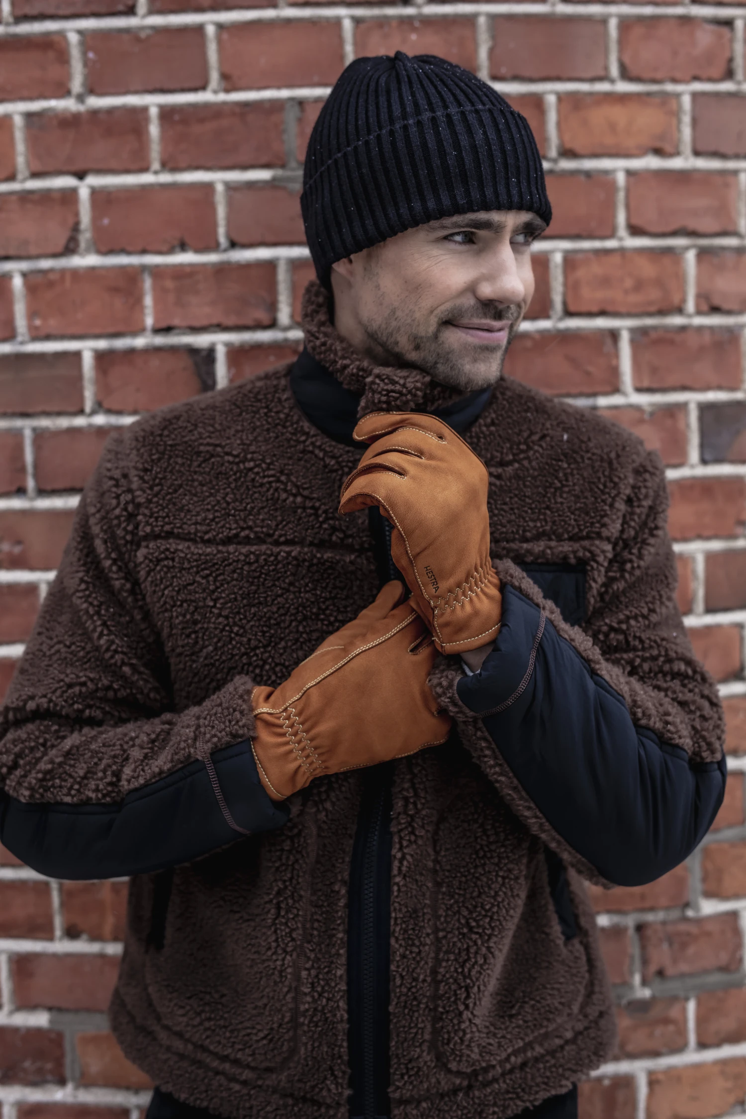 A robust glove in nubuck leather with a soft, warming wool lining. A retro-inspired design with characteristic seams and pre-curved for a really comfortable fit. Sewn in flexible nubuck cowhide, a beautiful, strong leather with a robust suede feel. The wool lining has a wool terry inside to warm and wick moisture away from the hand. An everyday favourite for chilly days in autumn and winter, equally at home in an urban setting and the great outdoors.