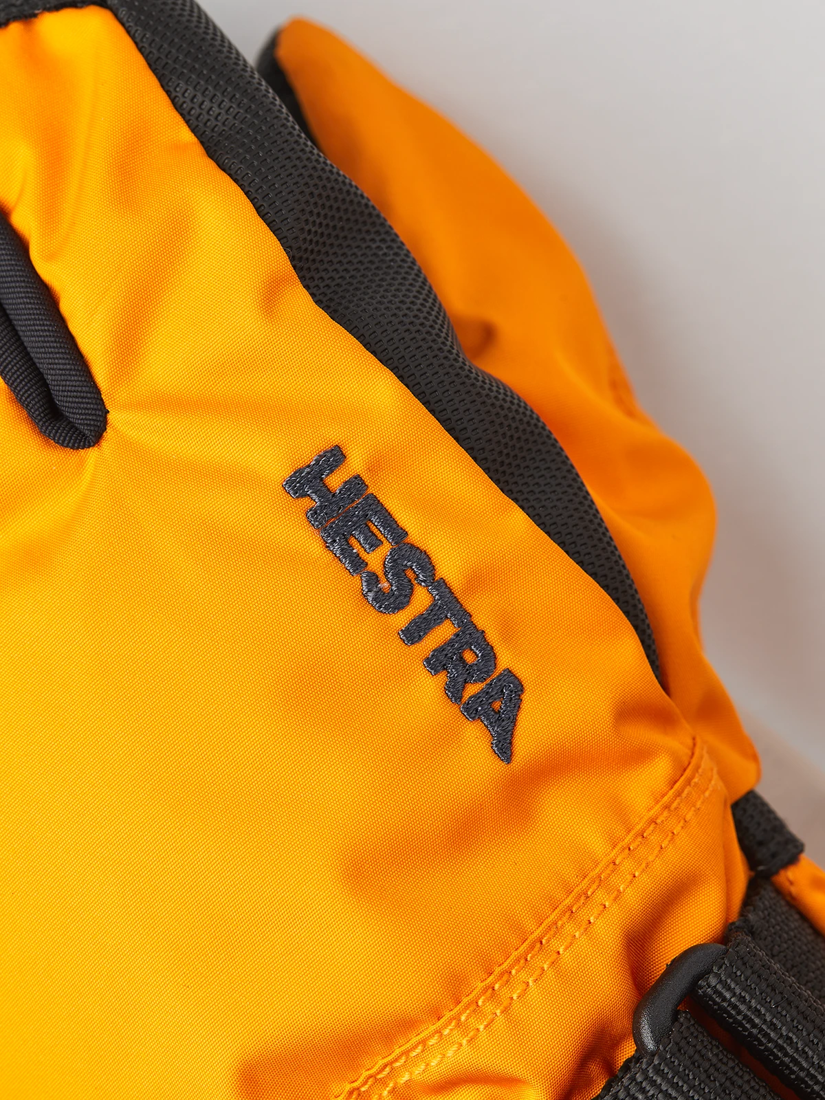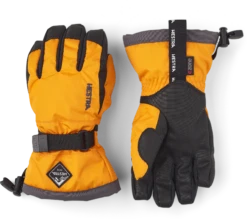 Wind and waterproof winter glove for kids A warm, comfortable kids’ glove for skiing, play and outdoor activities in cold winter weather. One of Hestra’s most popular junior gloves, sewn in hardwearing polyester with a waterproof, breathable CZone membrane and a longer cuff to keep the snow out. Fingertips and palm are reinforced with PU-coated synthetic fabric for extra strength and grip on poles, sledges and other winter gear. The liner is made of polyester fleece with warm synthetic insulation. Also available as a mitten and in a three-finger version.